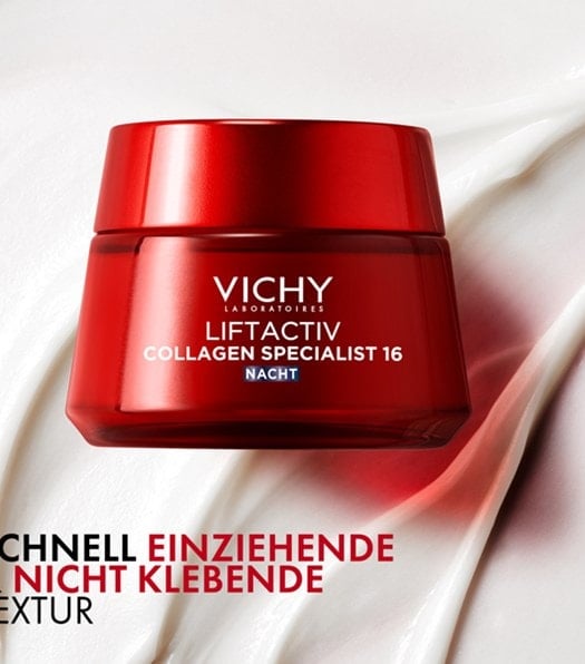 Bereits ab Mitte 20 beginnt der Kollagengehalt deiner Haut zu sinken, was wiederum zu Falten, Straffheitsverlust und weniger definierten Gesichtskonturen führt. Unsere Anti-Aging-Nachtcreme, die Vichy LIFTACTIV Collagen Specialist 16 Nacht, beinhaltet die exklusive Co-Bonding Technologie aus Rhamnose, Kollagen-Peptiden und Maitake. Dieser Wirkstoffkomplex boostet und stärkt die Verbindungen aller 16 Kollagen-Typen in der Haut. Dank der Co-Bonding Technologie verbessert die Anti-Aging-Nachtcreme 16 Zeichen der Hautalterung: Falten, feine Linien, Straffheit, Aufpolsterung, geglättete Haut, verfeinerte Textur, definierte Konturen, Stärkung der Hautschutzbarriere, minimierte Poren, Ausstrahlung, Geschmeidigkeit, Elastizität, Feuchtigkeit, Vitalität, Spannkraft sowie Ebenmäßigkeit. Erlebe mit LIFTACTIV Collagen Specialist 16 eine Nachtpflege, die dich und deine Haut in den Schönheitsschlaf bringt!