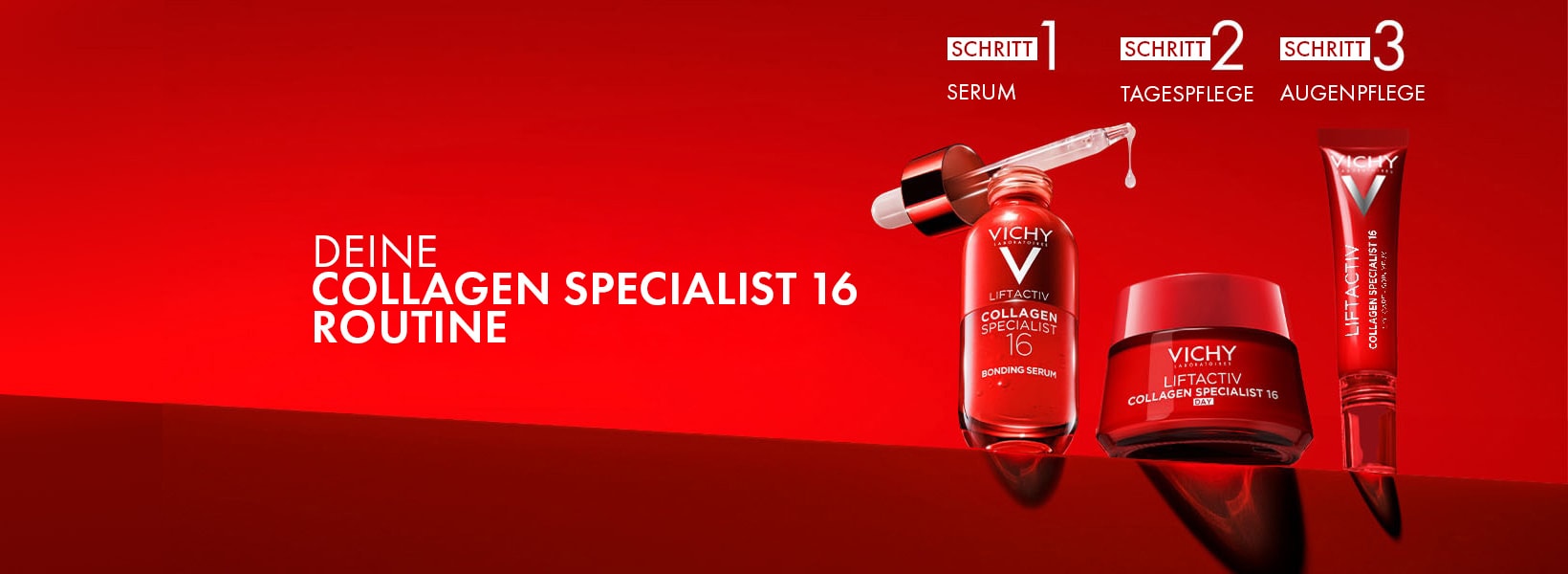 Anschließend trägst du die LIFTACTIV Collagen Specialist 16 auf, ein Anti-Aging-Serum, das die Festigkeit der Haut unterstützt und feine Linien glättet, indem es die natürliche Kollagenproduktion anregt. Die samtige Textur zieht schnell ein und macht dieses Serum zum idealen Zwischenschritt, bevor du deine Feuchtigkeitscreme aufträgst.