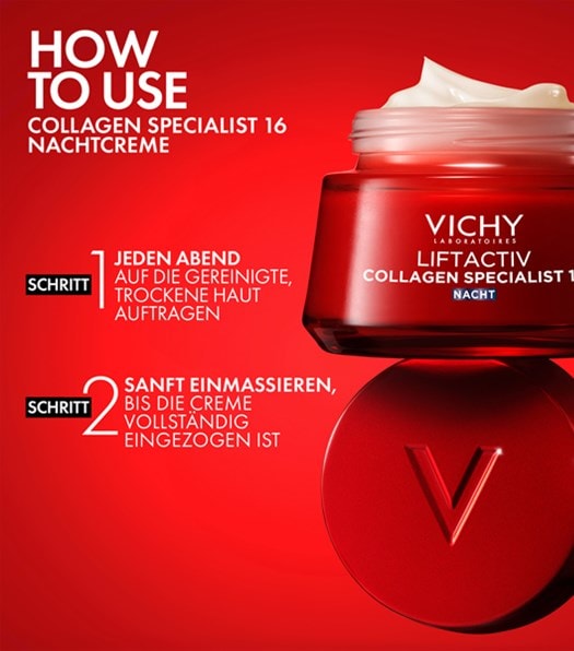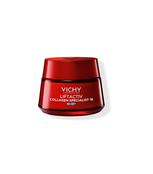 Bereits ab Mitte 20 beginnt der Kollagengehalt deiner Haut zu sinken, was wiederum zu Falten, Straffheitsverlust und weniger definierten Gesichtskonturen führt. Unsere Anti-Aging-Nachtcreme, die Vichy LIFTACTIV Collagen Specialist 16 Nacht, beinhaltet die exklusive Co-Bonding Technologie aus Rhamnose, Kollagen-Peptiden und Maitake. Dieser Wirkstoffkomplex boostet und stärkt die Verbindungen aller 16 Kollagen-Typen in der Haut. Dank der Co-Bonding Technologie verbessert die Anti-Aging-Nachtcreme 16 Zeichen der Hautalterung: Falten, feine Linien, Straffheit, Aufpolsterung, geglättete Haut, verfeinerte Textur, definierte Konturen, Stärkung der Hautschutzbarriere, minimierte Poren, Ausstrahlung, Geschmeidigkeit, Elastizität, Feuchtigkeit, Vitalität, Spannkraft sowie Ebenmäßigkeit. Erlebe mit LIFTACTIV Collagen Specialist 16 eine Nachtpflege, die dich und deine Haut in den Schönheitsschlaf bringt!