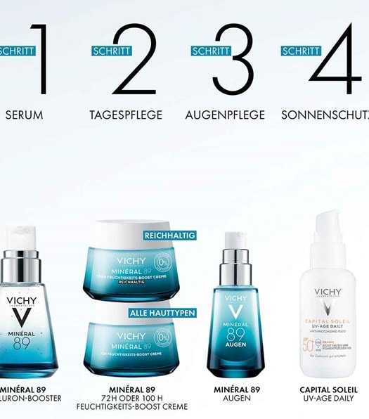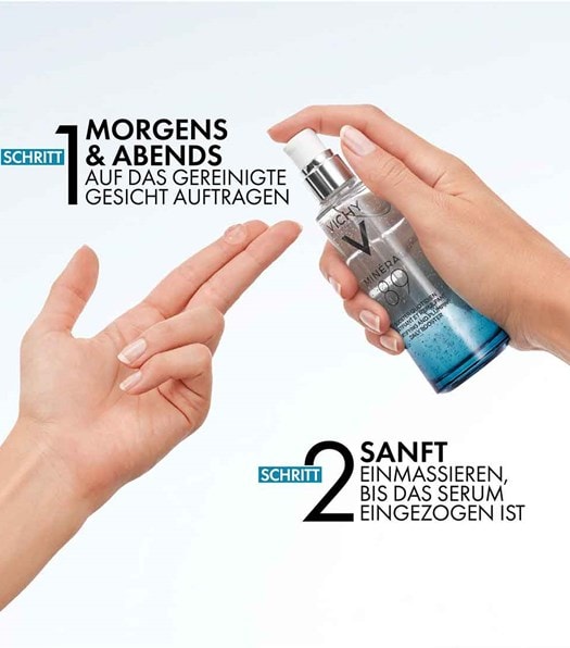 Entnimm eine kleine Menge des Vichy MINÉRAL 89 Hyaluron-Boost Serums und trage es morgens und abends auf die gereinigte Haut auf. Verteile es gleichmäßig auf Gesicht und Hals.